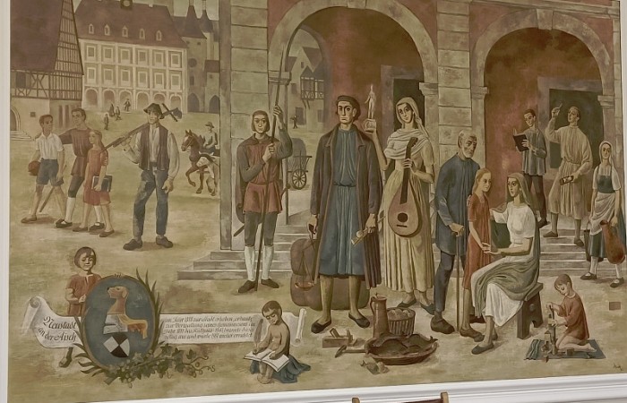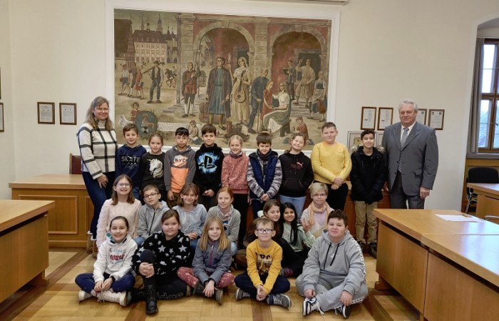 Danach erzählte uns der Bürgermeister einiges über sich, seine Berufswahl und seine Arbeit im Allgemeinen. Mithilfe eines sehr eindrucksvollen Bildes an der Wand des Sitzungssaales erklärte er uns die Aufgaben einer Stadt. So z.B., sauberes Trinkwasser, Betreuung und Bildung der Kinder, die Schaffung von Altenheimen, Möglichkeiten für sportliche Aktivitäten und vieles mehr. Danach beantwortete er geduldig alle unsere Fragen. Zum Schluss machten wir noch ein gemeinsames Foto mit ihm.