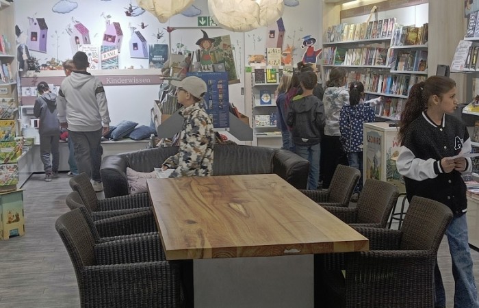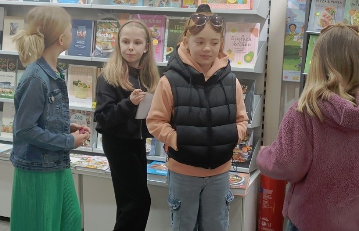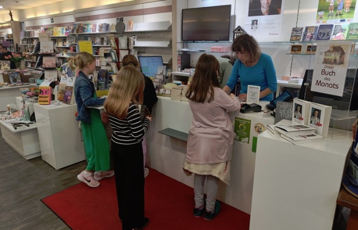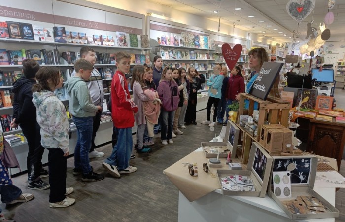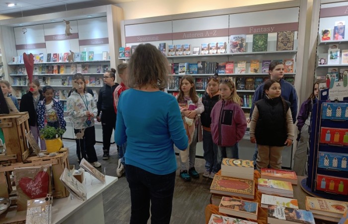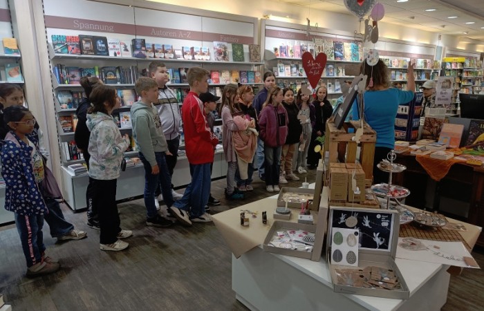 Aus diesem Anlass besuchten wir die Buchhandlung Dorn. Nach einer kurzen Vorstellung versuchten wir ein Quiz zu lösen und sahen uns die Buchhandlung ganz genau an. Am Ende unseres Besuches bekam jeder ein Buch geschenkt, das wir jetzt als Klassenlektüre lesen.