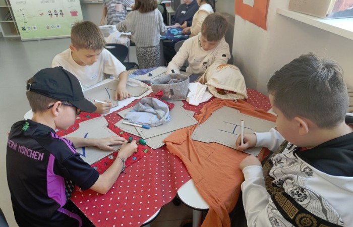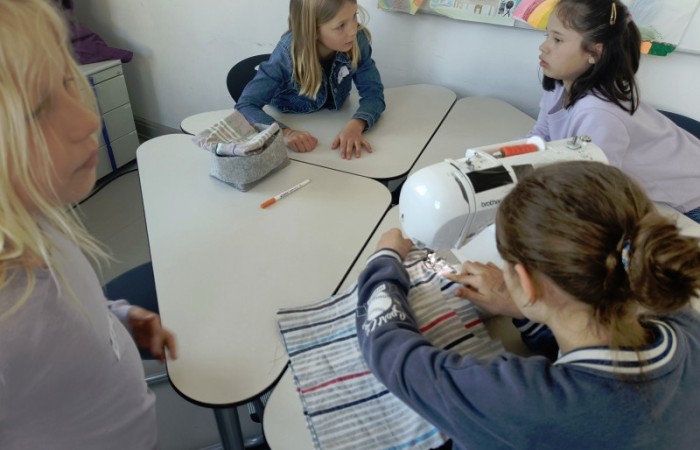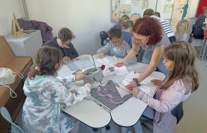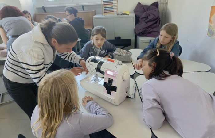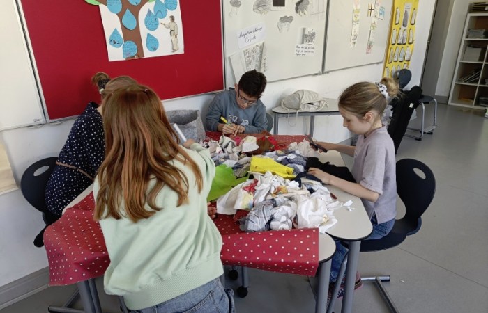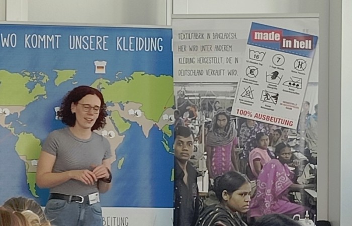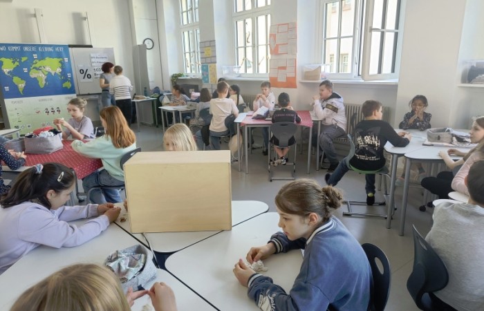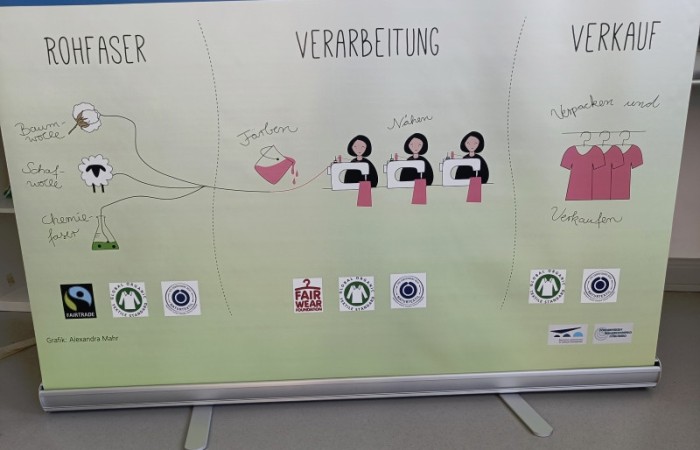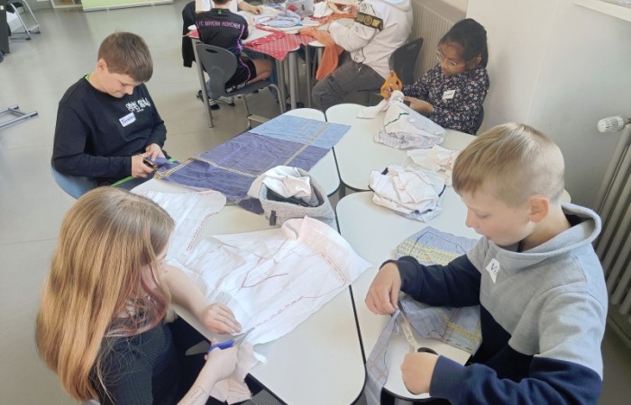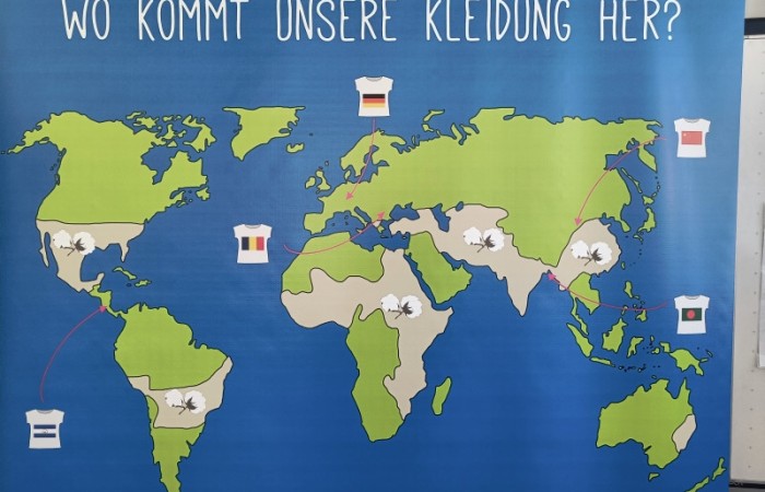 Die „mobile Textilfabrik“ zeigte den Kindern auf spielerische Art und Weise die Schere zwischen Arm und Reich. Nach einer kurzen Einführung zum Thema Baumwolle, in welcher alle ihre Etiketten an den Kleidungsstücken nach der Stoffzusammensetzung und der Herkunft untersuchten, wurden die Kinder dann selbst zu fleißigen Arbeiterinnen und Arbeitern am Fließband in einer fiktiven Fabriksituation. Aus einem Stück Stoff wurde durch grobes Ausschneiden, Aufzeichnen, Schneiden, mit Nadel und Faden zusammenheften, mit der Nähmaschine nähen und Verzieren/Bemalen nach und nach ein T-Shirt hergestellt. Nach der Gruppenarbeit (“Fließbandarbeit“) wurden die Kinder mit Gummibärchen bezahlt - leider nur sehr ungerecht, je nachdem welches Land sie zu Beginn zogen. Das gab Anlass zur Diskussion. Es fielen Sätze, wie: „Total unfair!“ oder „Ich habe genauso viel gearbeitet und bekomme nur ein Gummibärchen!“ Daraufhin erklärten die beiden Mitarbeiterinnen des Politmobils den Kindern, dass es genauso auf der Welt sei. Ein Textilarbeiter aus Bangladesch bekommt für die gleiche Arbeit leider viel weniger. Am Ende des Projekts wurde den Kindern gezeigt auf welche Siegel (z. B.: Fairtrade) sie achten sollten, um beim Kauf von Kleidung faire Arbeitsbedingungen zu berücksichtigen.