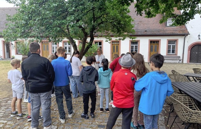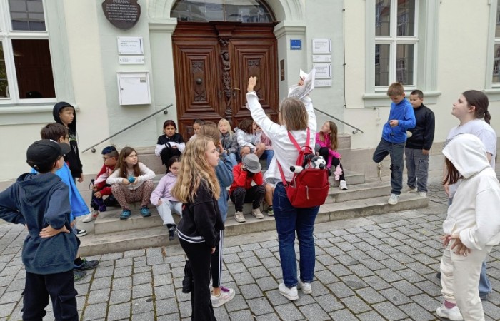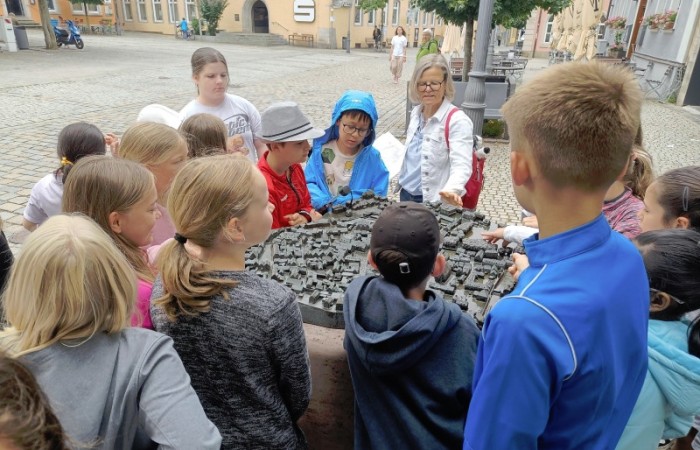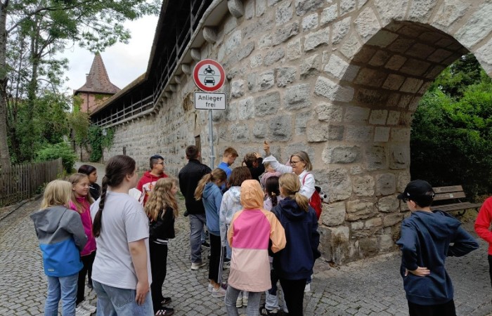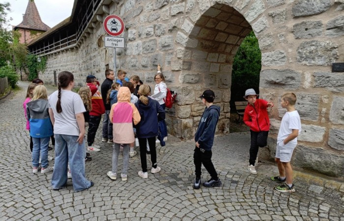 Wir starteten am Alten Schloss, in dem der Markgraf Albrecht Achilles immer nur zwei Wochen im Jahr, nämlich zur Jagdsaison im Juli oder August Hof hielt. Unter dem Schlosshof befinden sich die Ruinen einer noch viel älteren Burg. Danach ging es an der Lateinschule vorbei zur Stadtkirche, auf deren Turm früher immer der Feuerwächter seine Runden drehte. Seit 1557 gibt es unsere Kirchweih. Der Baumeister hat sich mit seinem Kopf am Turm der Kirche verewigt. Es hat etwas gedauert, bis wir ihn gefunden hatten. Dann ging es weiter zum Rathaus, das bereits fünfmal abgebrannt und früher ein markgräfliches Kaufhaus war. Besonders interessant ist, dass das Neustädter Siegel größer als das der Stadt Nürnberg ist. Auf unserem Stadtrundgang erfuhren wir noch viel mehr Geheimnisse. Wir leben in einer Stadt mit vielen tollen Bauten und viel Geschichte!