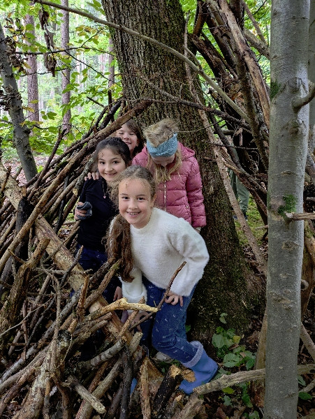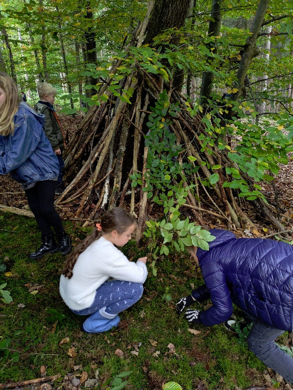 Fleißig bauten die Kinder der Klassen 4C, 3C und 3D im Schulwald einfallsreiche Lager. Manche Lager hatten sogar einen eigenen Vorgarten und einen Zaun. Die Kinder bauten geduldig, teilten Materialien und halfen einander, sodass sich jedes Team stolz präsentierte.