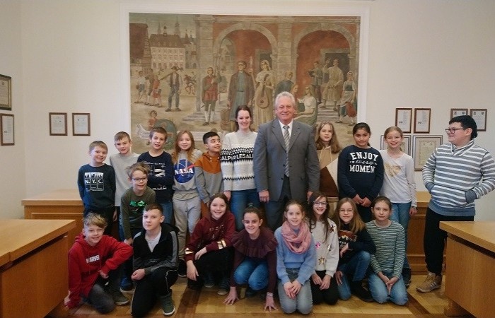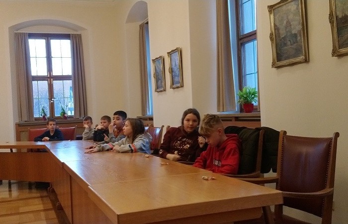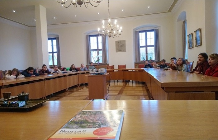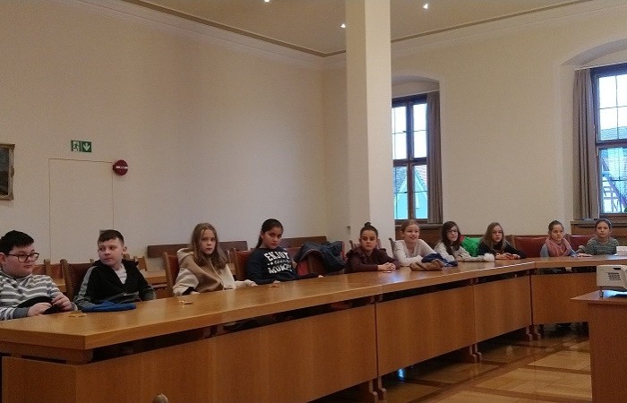 Deshalb ging es direkt nach den Weihnachtsferien zum Rathaus, um den Bürgermeister zu besuchen. Wir durften in den großen Sitzungssaal, bei dem erst einmal erklärt wurde, dass wir an den Plätzen der Stadträte sitzen.
