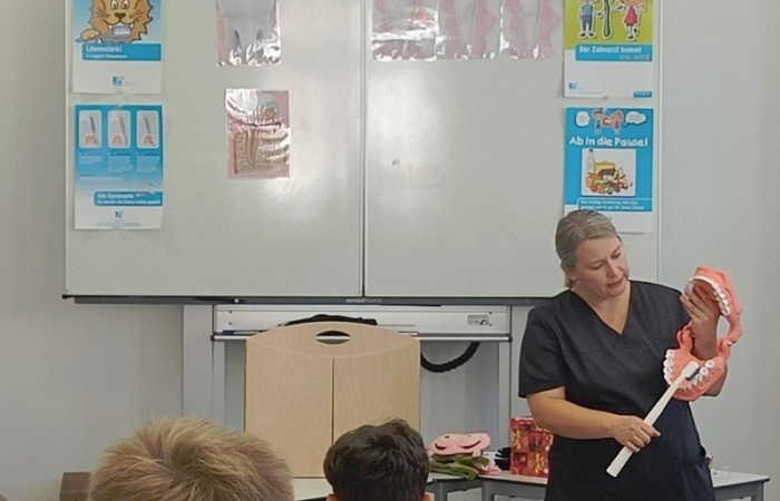Zusätzlich hatten sie die Möglichkeit, das richtige Zähneputzen zu erlernen bzw. zu wiederholen. Durch das KAI-Prinzip (Kauflächen, Außenflächen, Innenflächen) wurden sie dazu angeleitet, ihre Zähne gründlich zu pflegen. Ein interaktives Spiel half außerdem dabei, die verschiedenen Teile eines Zahnes kennenzulernen.