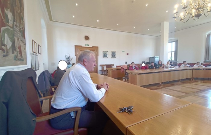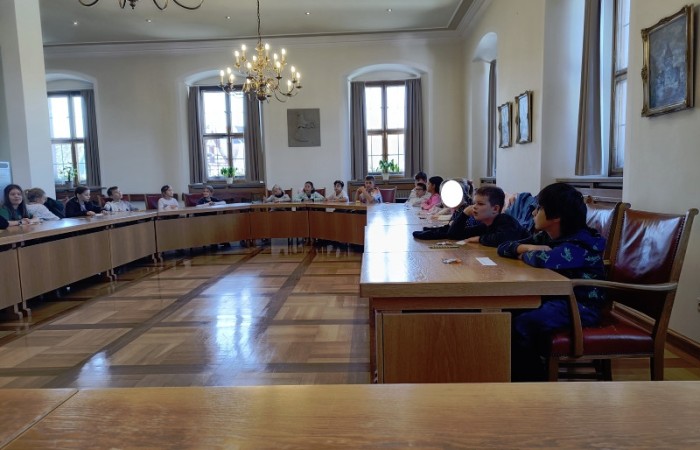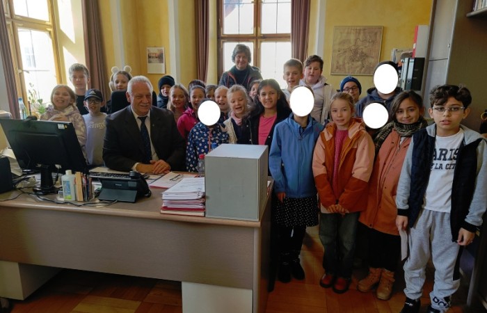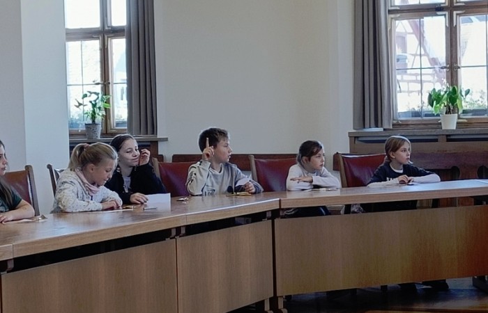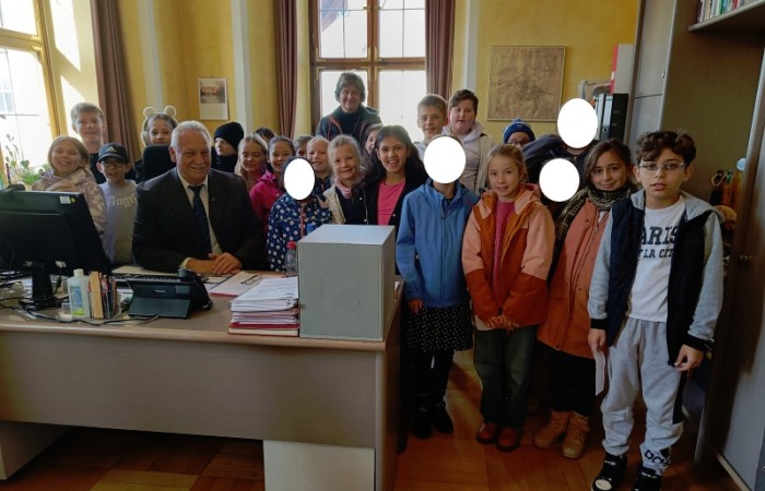 Wir waren sehr neugierig! Beim Betreten des großen Sitzungssaals staunten wir und waren von den Stühlen und dem großen Gemälde sehr beeindruckt. Wir durften uns auf die Plätze der Mitglieder des Stadtrats setzen. Nachdem uns Klaus Meier einiges über sich selbst und seine Arbeit erzählt hatte, stellte uns der 1. Bürgermeister auch einige Fragen, die wir alle beantworten konnten, da wir in den letzten Wochen fleißig waren uns sehr viel über die Gemeinde gelernt haben. Mit großer Begeisterung stellten wir ihm dann unsere Fragen, die er uns alle ausführlich beantwortete. Es war sehr spannend und interessant! Am Schluss machten wir noch ein gemeinsames Foto mit ihm und wurden dann vom Bürgermeister so herzlich verabschiedet, wie wir auch von ihm begrüßt wurden. Das war ein sehr informativer Ausflug!
