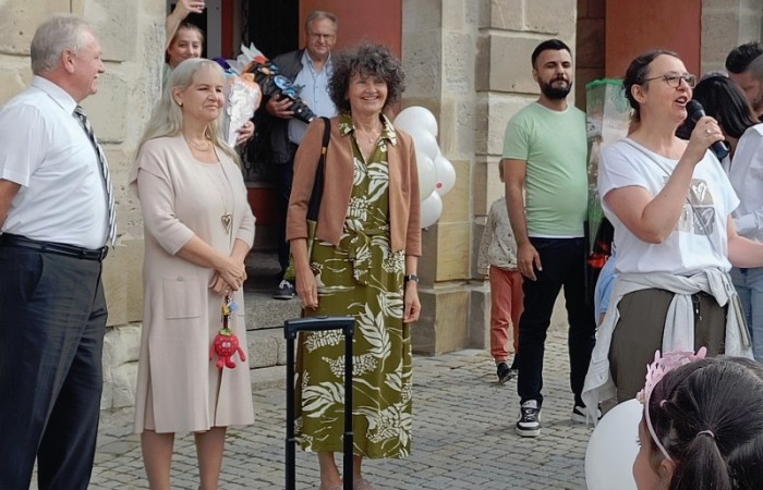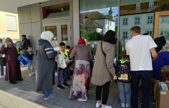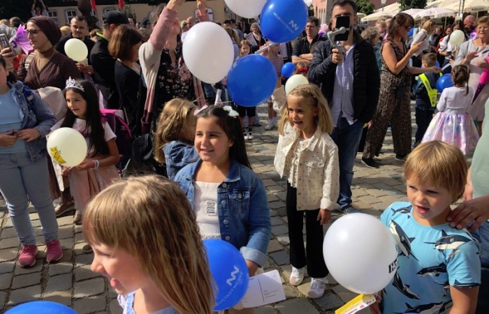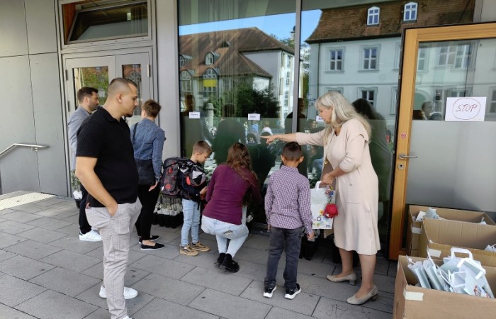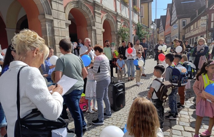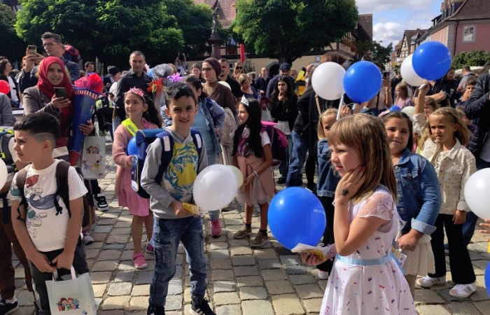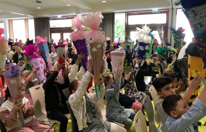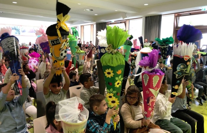 Nach der ökumenischen Schulanfangsfeier für Kinder aller Konfessionen in der evangelischen Stadtkirche versammelten sich Eltern, Verwandte und die neuen Erstklässler zur Einschulungsfeier in der Mensa.