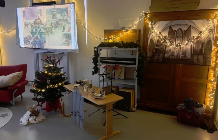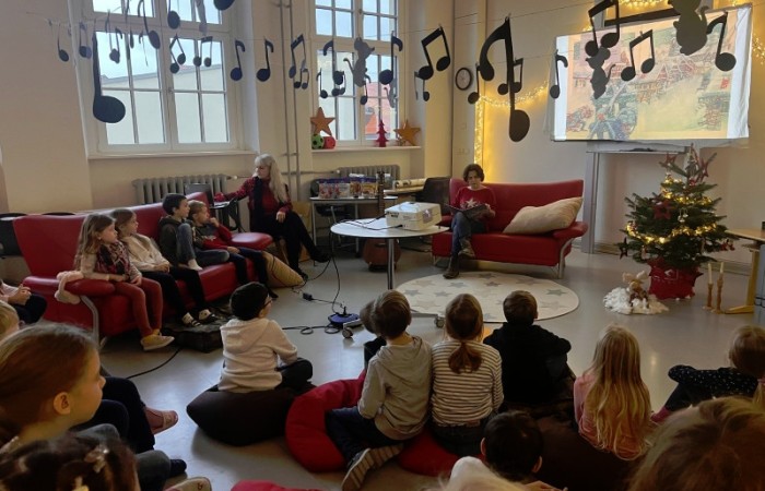 Eine „Stube“ in der eine Weihnachtsgeschichte der besonderen Art vorgelesen wird. Eingerichtet und dekoriert wurde diese Stube vom Elternbeirat. Dieses Jahr wurden alle Klassen der Grundschule in die Schulbücherei eingeladen. Der Raum war sehr liebevoll, weihnachtlich und passend zu dem Bilderbuch „Stille Nacht! Heilige Nacht!” dekoriert worden. Das Buch erzählt die Entstehungsgeschichte des wohl weltweit bekanntesten Weihnachtsliedes. Es gab 13 verschiedene Vorleser, wie beispielsweise ehemalige Kolleginnen der Grundschule, der Bürgermeister, Vertreter des Stadtrats und der Stadt, eine Polizistin und eine Vertreterin des Elternbeirats.