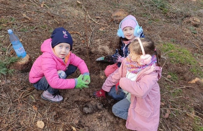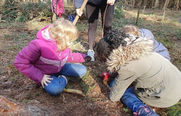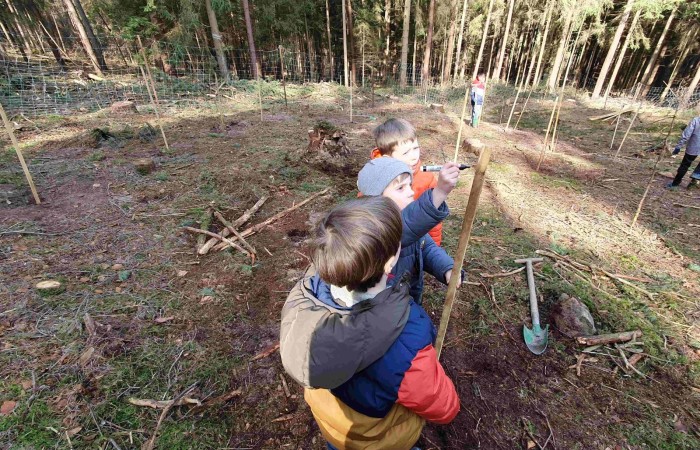 Dort empfing uns Förster Käßer und erklärte das Vorgehen und die Besonderheiten beim Baum pflanzen. Eifrig machten sich alle ans Werk und pflanzten verschiedene heimische Baumarten, um den Erhalt des Waldes zu unterstützen und somit einen Beitrag zum Umweltschutz zu leisten. Jede Gruppe hatte abschließend ein eigenes Bäumchen gepflanzt und mit einem Namensschild versehen, sodass sich das eigene Bäumchen bei einem Besuch im Wald schnell wiederfinden lässt.