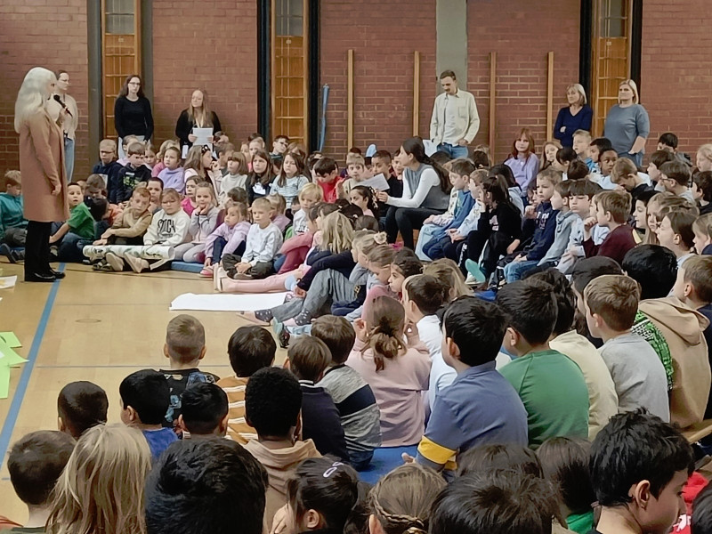 Alle Schüler begaben sich in der zweiten Stunde in die Turnhalle, um sich über ihre Schule viele Gedanken zu machen. Der Inhalt der Schulversammlung wurde von den zweiten Klassen mit Unterstützung durch Frau Röder moderiert.