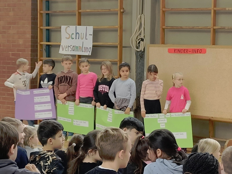 Zu Beginn sangen alle gemeinsam ein Lied zu den Kinderrechten: „Alle Kindern haben Rechte.“ Die zweiten Klassen hielten dazu den Text auf Plakaten hoch. Danach trug die dritte Klasse ihre Wünsche für eine gut gelingende Schule vor: