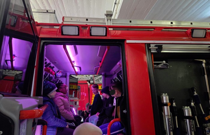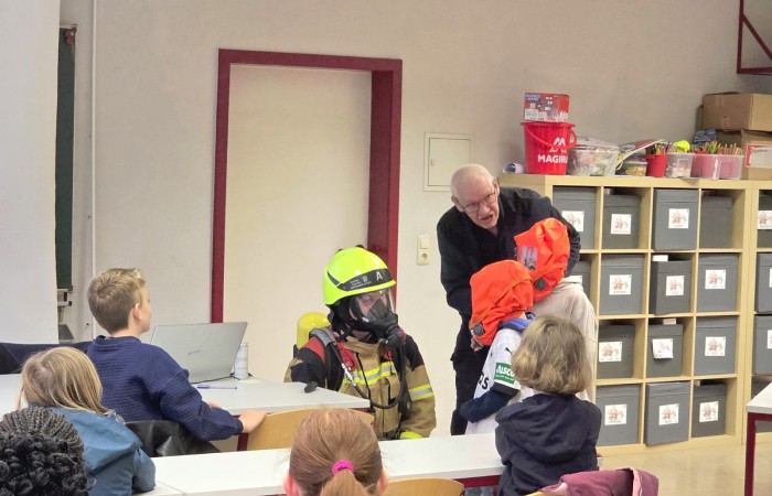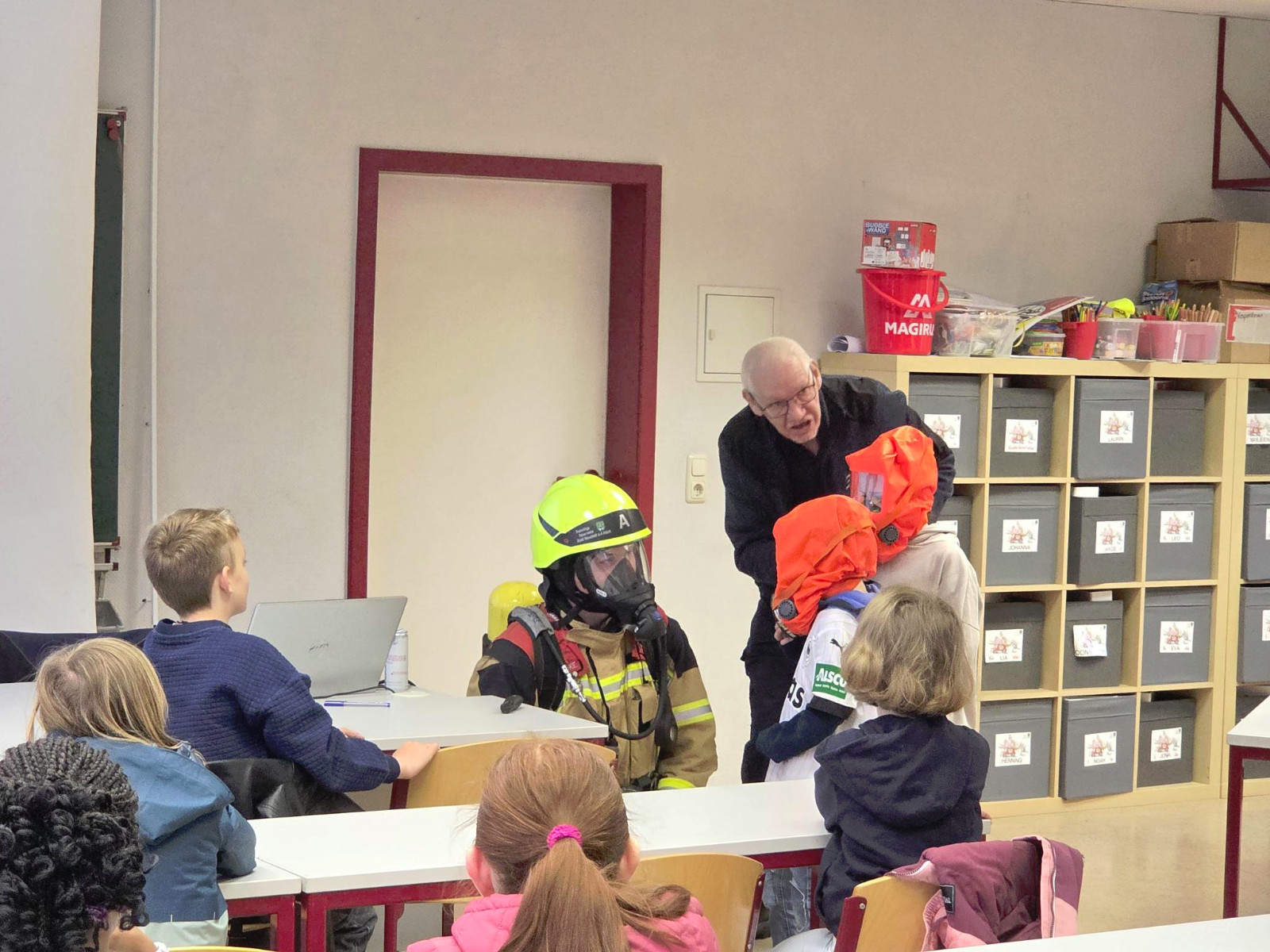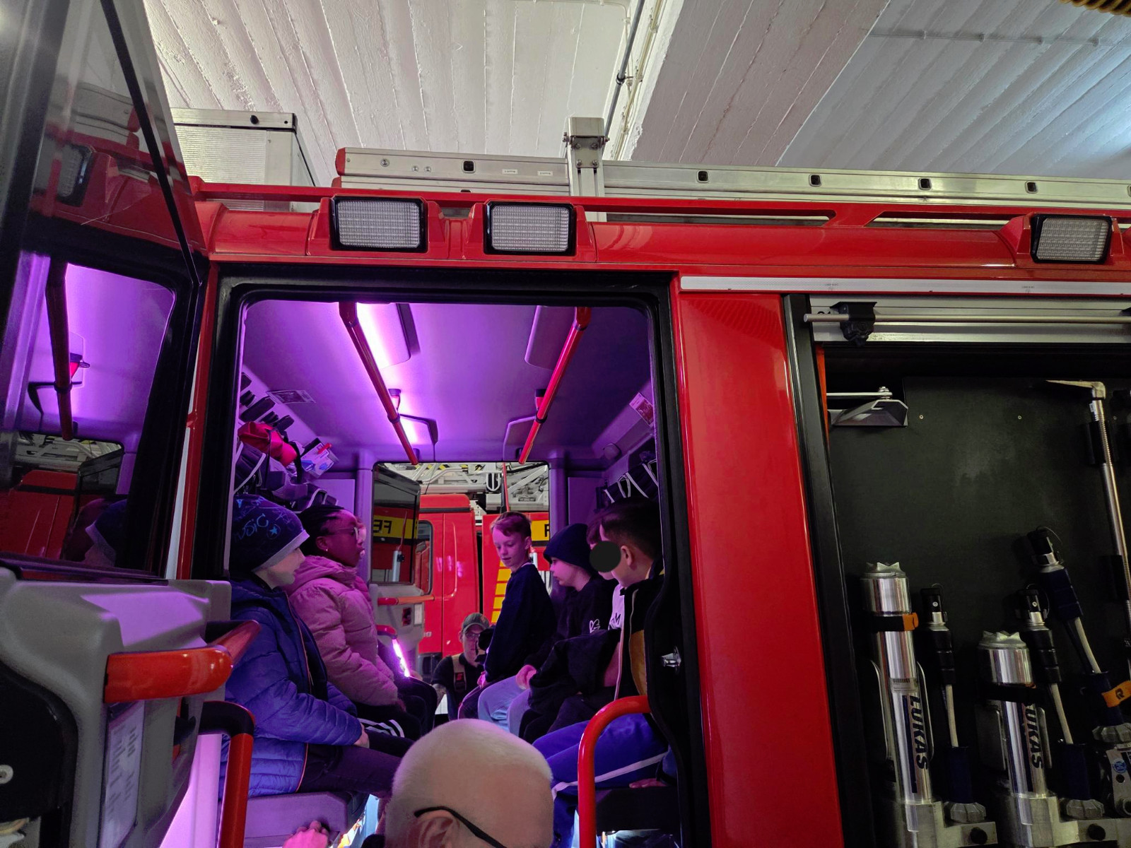 Darüber hinaus stellte die Feuerwehr ihre vielfältigen Aufgaben vor und zeigte den Kindern die Atemschutzausrüstung sowie verschiedene Löschfahrzeuge. Ein besonderes Highlight war, dass die Schülerinnen und Schüler sogar in eines der Feuerwehrfahrzeuge einsteigen durften.