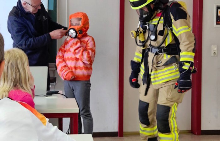 Darüber hinaus stellte die Feuerwehr ihre vielfältigen Aufgaben vor und zeigte den Kindern die Atemschutzausrüstung sowie verschiedene Löschfahrzeuge. Ein besonderes Highlight war, dass die Schülerinnen und Schüler sogar in eines der Feuerwehrfahrzeuge einsteigen durften.