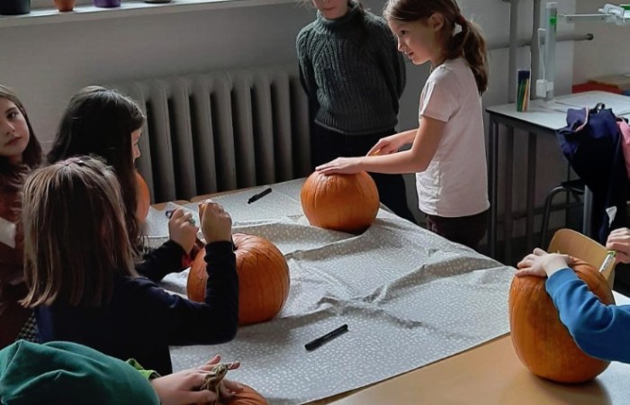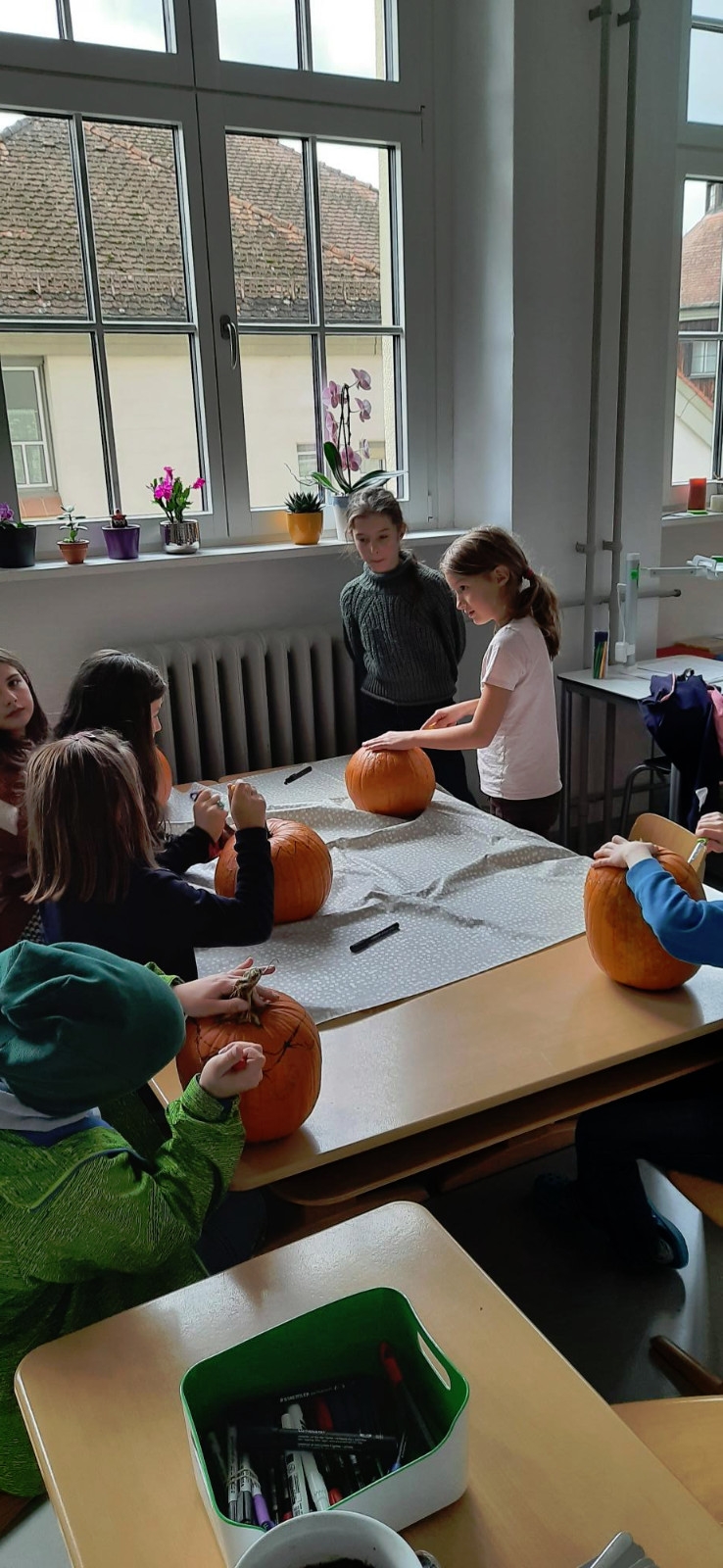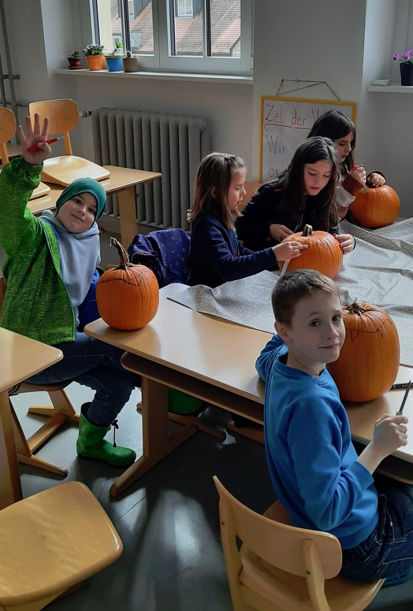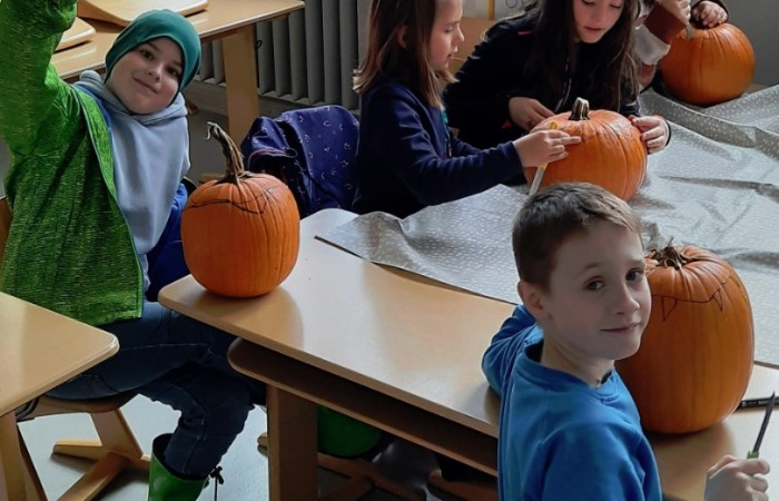 - Kürbisse wurden ausgehöhlt und geschnitzt, der Schulgarten wurde zu einem „Halloweengarten“.