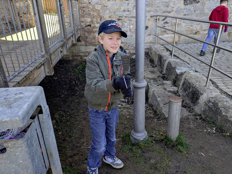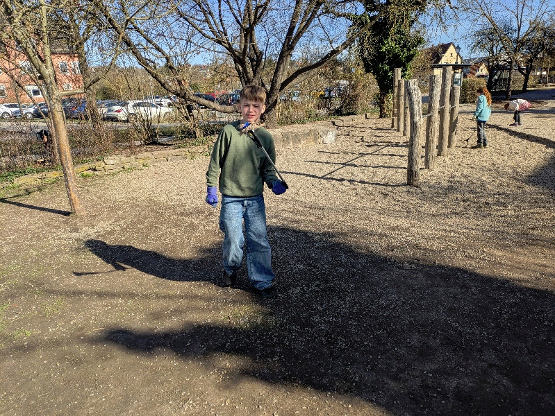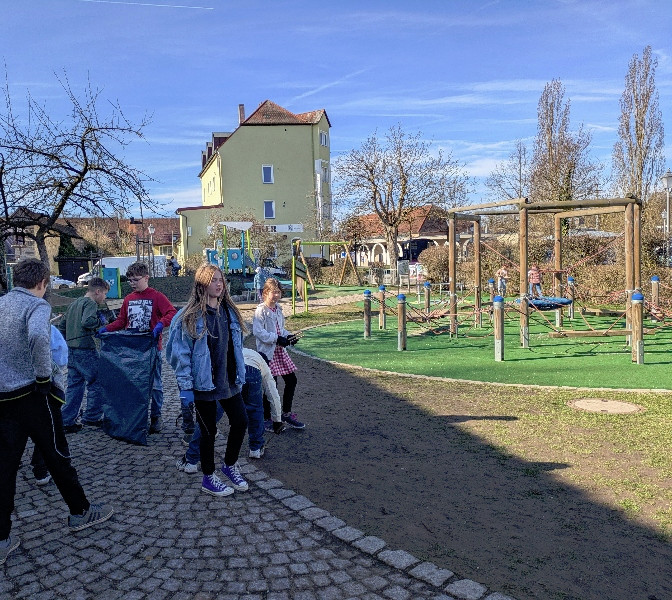 Nachdem wir den Pausenhof gründlich aufgeräumt hatten, sind wir gemeinsam weiter zum Labyrinth in Neustadt an der Aisch gegangen. Auch dort haben wir noch einmal Müll gesammelt. Leider fanden wir auch hier verschiedene Verpackungen und anderen Abfall, der eigentlich in den Mülleimer gehört.