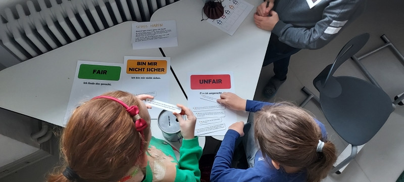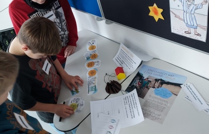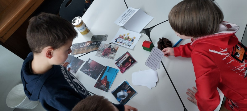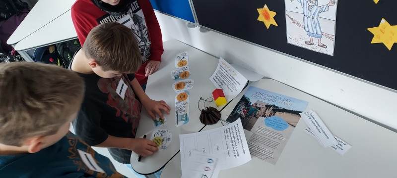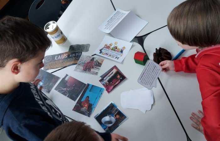 Nach wenigen Worten der Begrüßung und Hinführung waren die Schüler*innen schnell in kleine Sternsinger-Gruppen eingeteilt und diese mit Sammeldose und Laufzettel ausgestattet. Dann galt es im Klassenzimmer von Haus zu Haus zu ziehen und an vier Stationen als Team kleine Aufgaben zum Sternsingen und zum aktuellen Jahresthema „Sternsingen gegen Kinderarbeit – Schule statt Fabrik“ zu meistern.