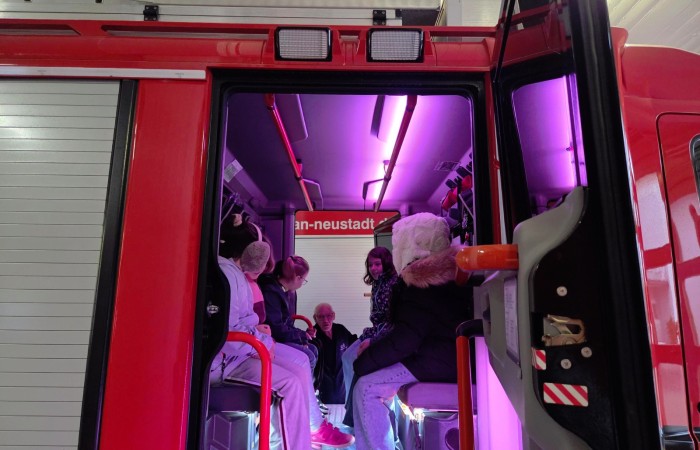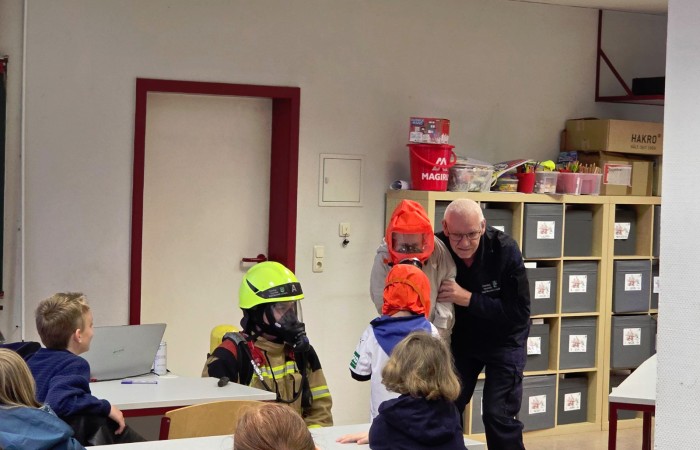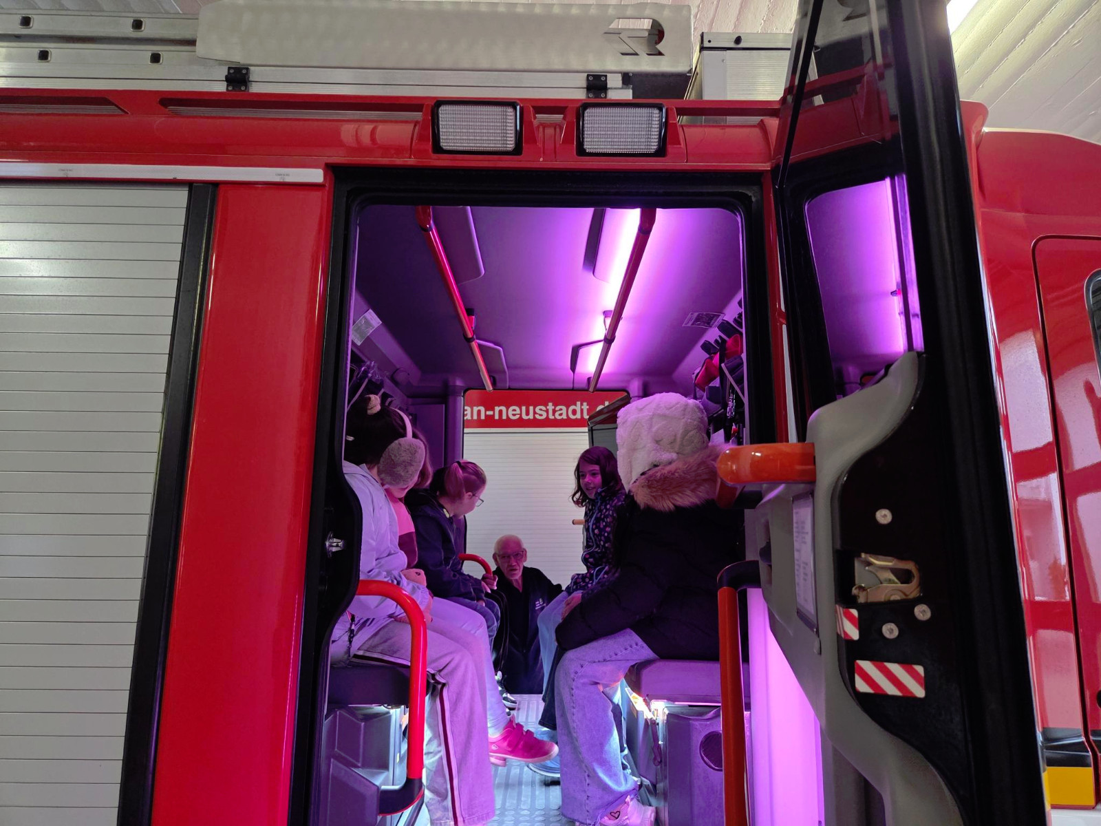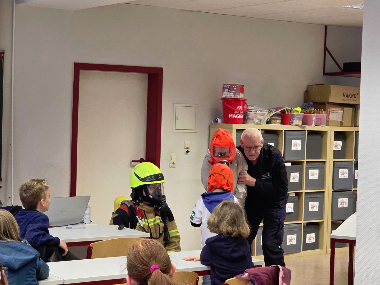 Darüber hinaus stellte die Feuerwehr ihre vielfältigen Aufgaben vor und zeigte den Kindern die Atemschutzausrüstung sowie verschiedene Löschfahrzeuge. Ein besonderes Highlight war, dass die Schülerinnen und Schüler sogar in eines der Feuerwehrfahrzeuge einsteigen durften.
