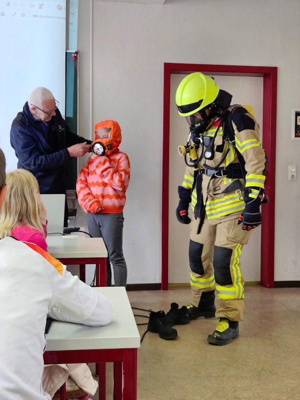 Darüber hinaus stellte die Feuerwehr ihre vielfältigen Aufgaben vor und zeigte den Kindern die Atemschutzausrüstung sowie verschiedene Löschfahrzeuge. Ein besonderes Highlight war, dass die Schülerinnen und Schüler sogar in eines der Feuerwehrfahrzeuge einsteigen durften.