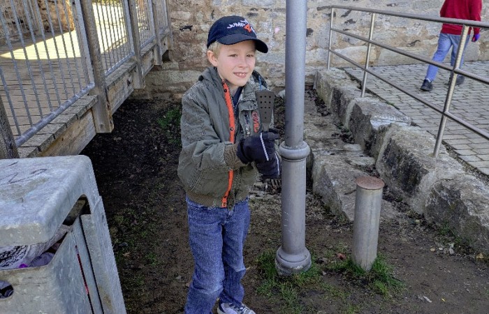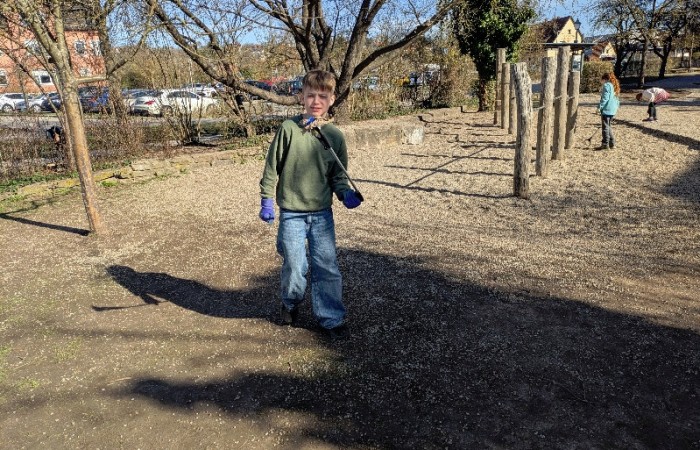 Nachdem wir den Pausenhof gründlich aufgeräumt hatten, sind wir gemeinsam weiter zum Labyrinth in Neustadt an der Aisch gegangen. Auch dort haben wir noch einmal Müll gesammelt. Leider fanden wir auch hier verschiedene Verpackungen und anderen Abfall, der eigentlich in den Mülleimer gehört.